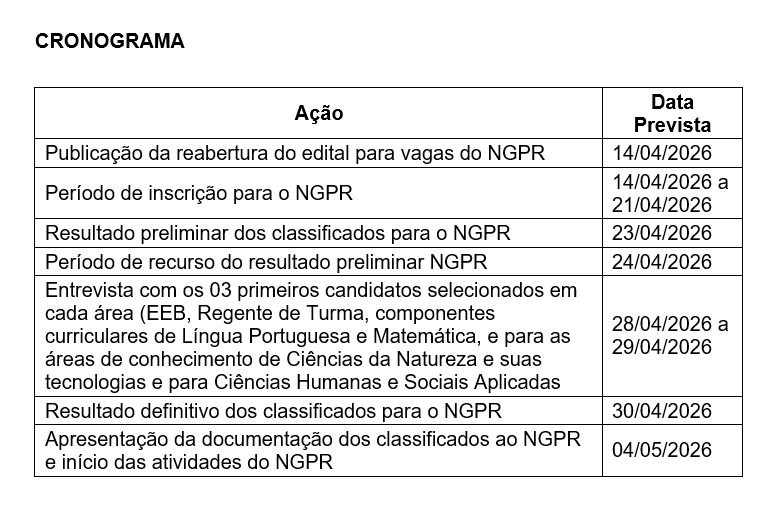 A Superintendência Regional de Ensino de Caratinga reabre as inscrição do Edital SRE nº 01, de 03 de fevereiro de 2026, que estabelece normas para a realização do Processo de Seleção Interna (PSI), destinado à seleção de servidores efetivos ocupantes dos cargos de Especialista em Educação Básica (EEB) / Professor de Educação Básica (PEB) – Regente de Turma e Professor de Educação Básica (PEB) – Regente de Aulas, para composição de cadastro de reserva e eventual atuação em vagas temporárias de participação no âmbito do Programa de Recomposição das Aprendizagens (PRA), desenvolvido pela Subsecretaria de Desenvolvimento da Educação Básica da Secretaria de Estado de Educação de Minas Gerais (SEE/MG).
